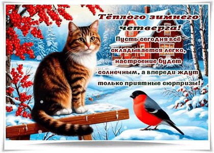 Тёплого зимнего четверга! Пусть сегодня всё складывается легко, настроение будет солнечным, а впереди ждут только приятные сюрпризы!