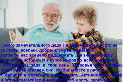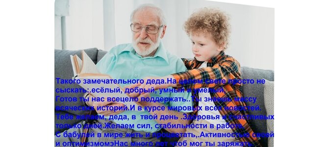 Теги:такого замечательного деда на целом свете просто не сыскать весёлый, добрый, умный и умелый, готов ты нас всецело поддержать ты знаешь массу всяческих историй и в курсе мировых всех новостей тебе желаем, деда, в твой день здоровья и счастливых только дней желаем сил, стабильности в работе, с бабулей в мире жить и процветать, активностью своей и оптимизмом нас много лет чтоб мог ты заряжать