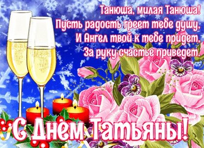 Танюша, милая Танюша! Пусть радость греет тебе душу. И Ангел твой к тебе придет, за руку счастье приведет. С Днем Татьяны!