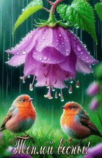 Живописная и нежная открытка с изображением двух маленьких пушистых птичек, сидящих на траве под каплями дождя. В центре композиции — крупный распустившийся цветок фуксии насыщенного фиолетового цвета, покрытый сверкающими каплями воды. Атмосфера весенней свежести, уюта и природной красоты. На переднем плане элегантная надпись на русском языке «Теплой весны!», идеально подходящая для поздравления близких с наступлением весны. Высокое качество изображения с детализированной текстурой перьев и лепестков.