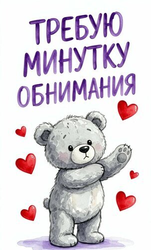 Милая акварельная иллюстрация с серым плюшевым мишкой, который тянет лапки для объятий. Вокруг медвежонка разбросаны ярко-красные сердечки. В верхней части картинки крупная надпись на русском языке «ТРЕБУЮ МИНУТКУ ОБНИМАНИЯ», выполненная в художественном стиле. Изображение передает атмосферу нежности, любви и потребности в ласке. Подходит для открыток, стикеров, принтов на одежду или поздравительных сообщений для близких людей.
