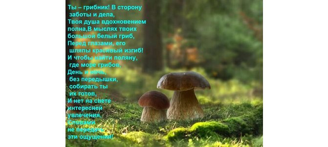 Теги:ты грибник в сторону заботы и дела, твоя душа вдохновением полна, в мыслях твоих большой белый гриб, перед глазами, его шляпы красивый изгиб и чтобы найти поляну, где море грибов, день и ночь, без передышки, собирать ты их готов, и нет на свете интересней увлечения, словами не передать эти ощущения