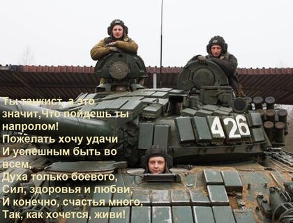 Теги:ты танкист, а это значит, что, пойдешь, напролом, пожелать, хочу, удачи, успешным, быть, всем, духа только боевого, сил