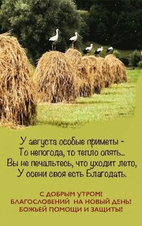 У августа особые приметы - то непогода, то тепло опять... Вы не печальтесь, что уходит лето, у осени своя есть Благодать. С добрым утром! Благословений на новый день! Божьей помощи и защиты!