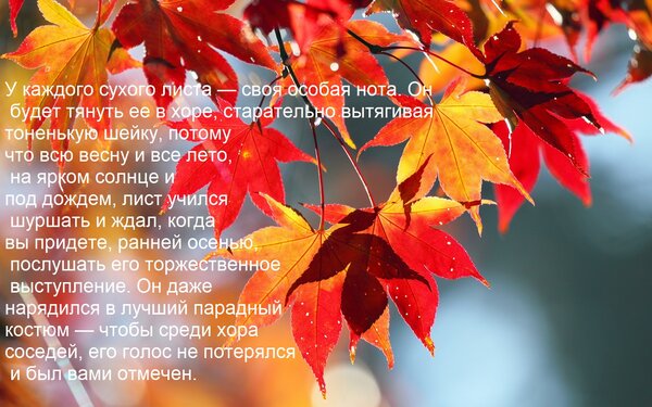 Теги:каждого, сухого, листа, своя, особая, нота, будет, тянуть, хоре, старательно вытягивая тоненькую шейку, потому что всю весну и все лето, на ярком солнце и под дождем, лист учился шуршать и ждал