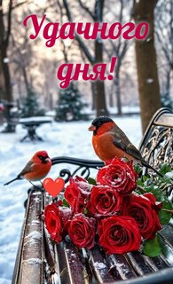 На заснеженной скамейке лежит букет алых роз и сидят две птички с красными грудками. Вверху надпись " Удачного дня!"