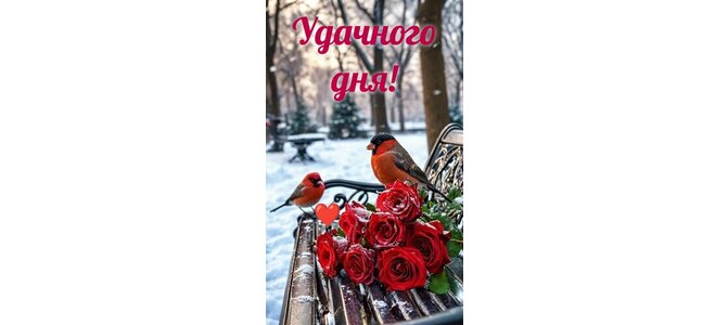 На заснеженной скамейке лежит букет алых роз и сидят две птички с красными грудками