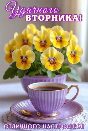 Красочное поздравительное изображение к вторнику. На переднем плане стоит изысканная фиолетовая чашка кофе с золотистой каймой на блюдце, рядом лежит ложечка. За чашкой расположен пышный букет ярко-желтых анютиных глазок (виолы) в фиолетовом горшке. В верхней части картинки каллиграфическая надпись на русском языке «Удачного вторника!», а внизу — «Отличного настроения!». Теплые тона и цветочная композиция создают уютную и позитивную атмосферу для отправки друзьям и близким в мессенджерах или соцсетях.
