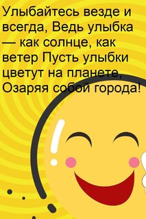 Теги:улыбайтесь везде и всегда, ведь улыбка как солнце, как ветер пусть улыбки цветут на планете, озаряя собой города