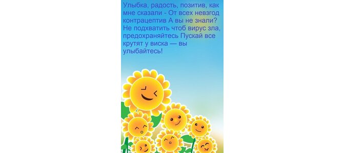 Теги:улыбка, радость, позитив, как мне сказали - от всех невзгод контрацептив а вы не знали не подхватить чтоб вирус зла, предохраняйтесь пускай все крутят у виска вы улыбайтесь