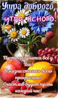 Красивая открытка с пожеланием доброго и ясного утра. На изображении представлен живописный натюрморт: букет из ярких васильков и ромашек в керамической вазе, дополненный спелыми ягодами малины и виноградом, а также сочными фруктами. Атмосферное изображение наполнено утренним светом и позитивными эмоциями. Идеально подходит для отправки близким, друзьям и коллегам в мессенджерах (WhatsApp, Viber) для создания хорошего настроения на весь день. Text на картинке: «Утра доброго, утра ясного! Пусть получится всё у Вас! В жизни столько всего прекрасного! Счастлив будет пусть каждый час!»