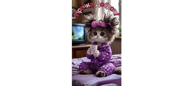 Забавный котëнок в пижамке и с чашкой чая на кровати.