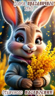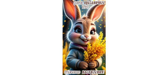 Теги:доброе утро, утро, зайка, милота, цветы, мимоза, пожелания на каждый день, пушистик, отличного настроения, красивая картинка, праздничного утра