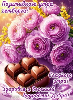 Теги:утро четверга, четверг, конфеты, шоколад, красивая картинка, пионы, розы, сердечки, здоровья, весенней бодрости, добра, сладкого утра, позитива