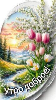 Живописная открытка с пожеланием доброго утра. На изображении запечатлен нежный весенний пейзаж: букет розовых и белых тюльпанов на фоне цветущей ветви сирени или жасмина. Задний план украшен мягким закатом или рассветом в горах, протекающим ручьем и хвойным лесом. Атмосфера наполнена уютом, свежестью и вдохновением. Идеально подходит для отправки близким в мессенджерах как красивое приветствие и позитивное начало дня.