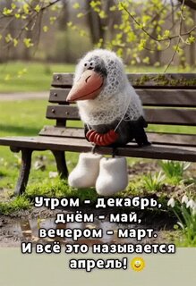 Забавное изображение с плюшевой игрушкой птицы, сидящей на деревянной скамейке в парке. На картинке наложен юмористический текст на русском языке, описывающий переменчивую погоду в апреле: «Утром — декабрь, днём — май, вечером — март. И всё это называется апрель!». Идеально подходит для позитивных постов в социальных сетях, мемов о весенней погоде и настроения.