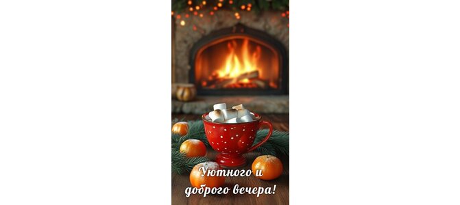 Перед растопленным камином стоит столик с вазочкой сладостей и мандаринами. Подпись на открытке "Уютного и доброго вечера!"
