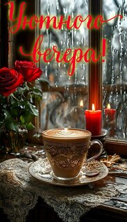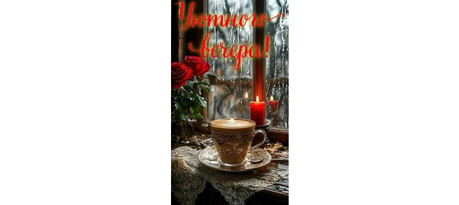 Около окна, на столике стоит чашка с кофе, вазочка с розами и горящая свеча.