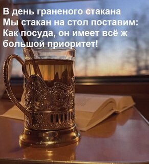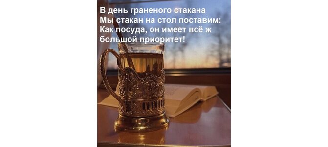 Открытка "В день граненого стакана Мы стакан на стол поставим: Как посуда, он имеет всё ж большой приоритет!"