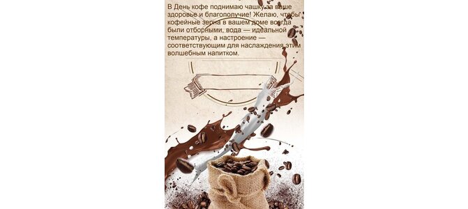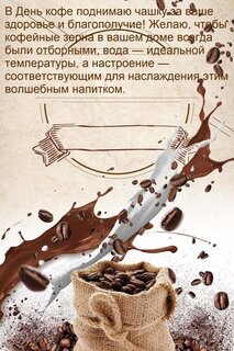 Открытка "В день кофе поднимаю чашку за ваше здоровье и благополучие! Желаю, чтобы кофейные зерна в вашем доме"