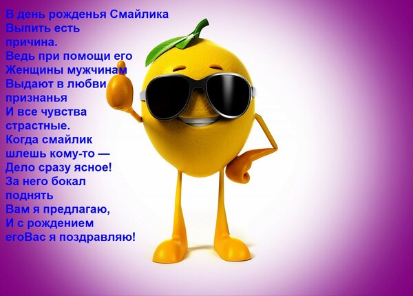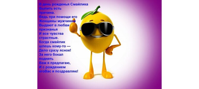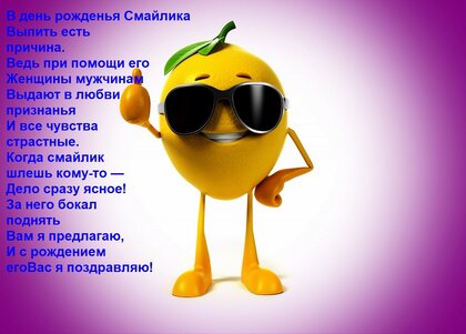 Открытка "В день рожденья смайлика выпить есть причина. Ведь при помощи его женщины мужчинам выдают в любви признанья"