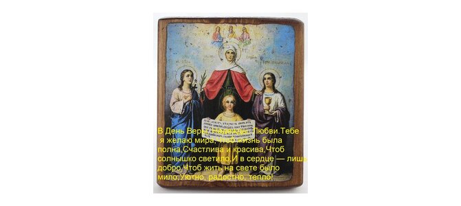 Теги:в день веры, надежды, любви тебе я желаю мира, чтоб жизнь была полна, счастлива и красива, чтоб солнышко светило, и в сердце лишь добро, чтоб жить на свете было мило, уютно, радостно, тепло
