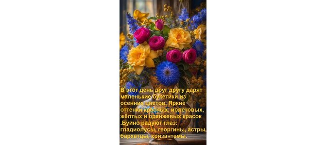 Открытка "В этот день друг другу дарят маленькие букетики из осенних цветов. Яркие оттенки красных, фиолетовых"