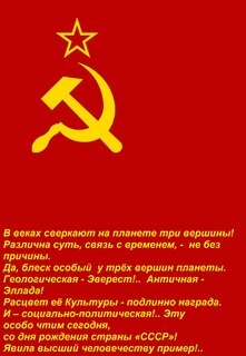 В веках сверкают на планете три вершины! Различна суть, связь с временем, - не без причины. Да, блеск особый у трёх вершин планеты. Геологическая - Эверест!... Античная - Эллада! Расцвет её Культуры - подлинно награда. И – социально-политическая!... Эту особо чтим сегодня, со дня рождения страны «СССР»! Явила высший человечеству пример!...