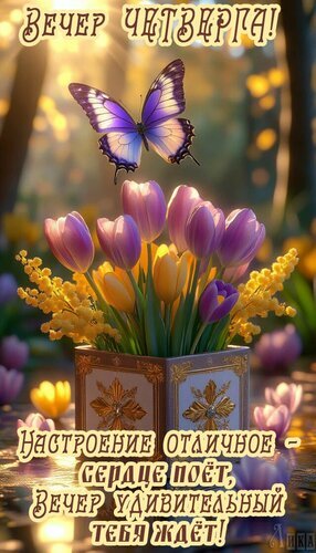 Теги:вечер четверга, четверг, добрый вечер, отличного настроения, цветы, мимоза, тюльпаны, бабочка, удивительного вечера, позитива, красивая картинка
