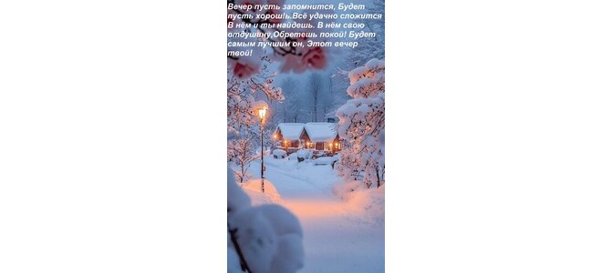 Теги:вечер пусть запомнится, будет пусть хорош всё удачно сложится в нём и ты найдешь в нём свою отдушину, обретешь покой будет самым лучшим он, этот вечер твой