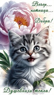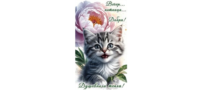 Теги:вечер пятницы, пятница, дни недели, добра, душевного тепла, котенок, пушистик, милота, красивая картинка, цветок, пион