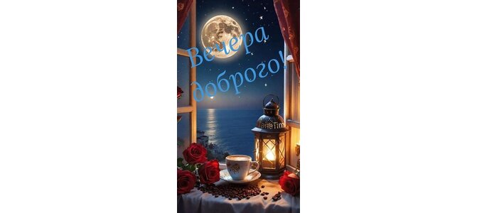 Перед распахнутым окном стоит стол с чашкой чая,за жженый фонарь, лежит букет роз, вдалеке серебрится море.
