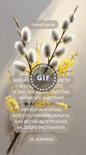 Анимированная открытка "Верба - вестник радости в ореоле святости. И, как праздник, светлая, как мечта заветная. Мягкая и не"