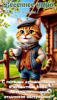 Открытка "Весеннее утро Пятницы. С первыми лучами солнца и ароматным кофе. Лёгкой пятницы..."