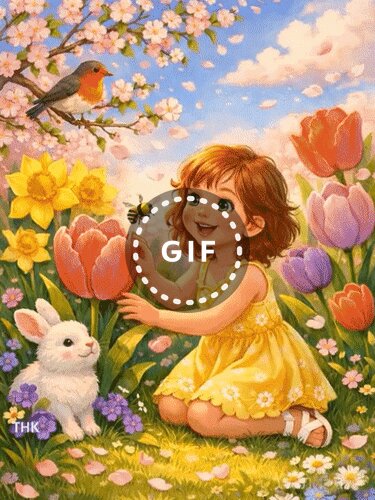 Милая детская иллюстрация в весеннем стиле, изображающая маленькую девочку с каштановыми волосами в желтом платье, играющую в цветущем саду. На картинке представлены яркие тюльпаны, желтые нарциссы, нежные весенние цветы, пушистый белый кролик и маленькая пчелка, летающая рядом. В верхней части композиции на ветке цветущей вишни сидит очаровательная птичка. Яркие, насыщенные цвета и сказочная атмосфера создают ощущение радости, тепла и весеннего пробуждения природы. Идеально подходит для детских книг, декора детских комнат и праздничного оформления.
