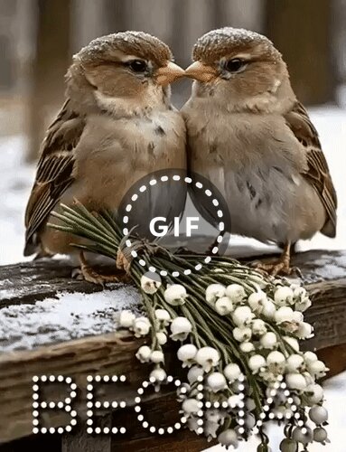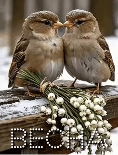 Милое и трогательное изображение двух маленьких воробьев, стоящих рядом на деревянном перилах, покрытых тонким слоем снега. Птицы прижались друг к другу клювами, создавая ощущение нежности и тепла. Перед ними лежит изящный букет нежных белых цветов, напоминающих ландыши, что придает композиции романтичный и сказочный вид. На переднем плане видна стильная надпись «BECHA», выполненная из светящихся точек. Фотография сочетает в себе зимнюю атмосферу и весеннюю нежность, вызывая чувство уюта и любви.