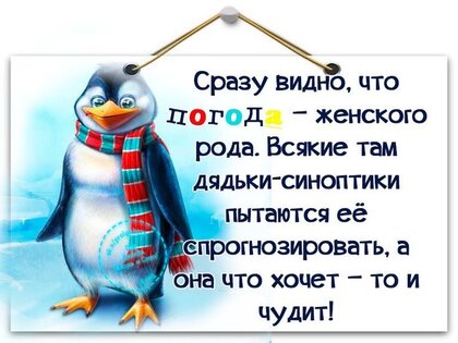 Юмористическая открытка с изображением милого пингвина в теплом полосатом шарфе на светлом фоне. На картинке размещен забавный текст на русском языке о непредсказуемости погоды: «Сразу видно, что погода — женского рода. Всякие там дядьки-синоптики пытаются её прогнозировать, а она что хочет — то и чудит!». Идеально подходит для отправки друзьям и близким в качестве позитивного поздравления или шутливого сообщения о переменчивой погоде. Тяжелый юмор, природа, зима, оптимизм.