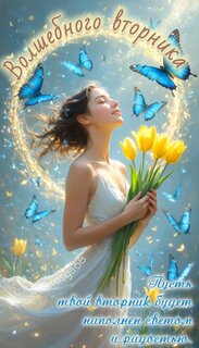 Пусть этот вторник станет для вас особенным! В центре композиции — образ юности и весны: девушка с букетом солнечных тюльпанов в окружении лазурных бабочек, которые словно принесли на своих крыльях свет и добрые вести.