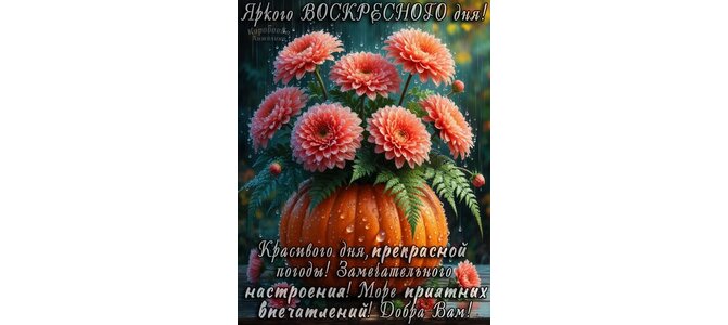Яркого воскресного дня! Красивого дня, прекрасной погоды! Замечательного настроения! Море приятных впечатлений! Добра вам!