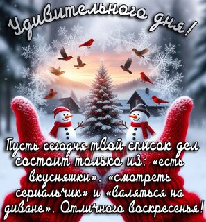 Теги:воскресенье, дни недели, снег, зима, новый год, подарки, снеговик, птички, женские руки, варежки, юмор, позитив