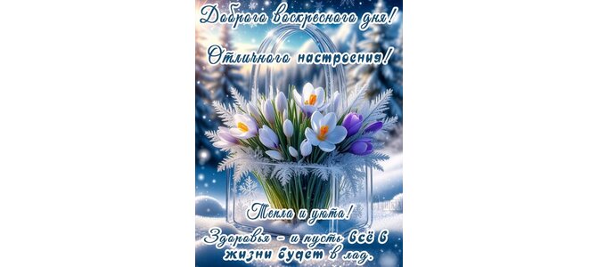 Теги:воскресенье, крокусы, подснежники, зима, снег, лес, дамская сумочка, красивая картинка, здоровья, тепла и уюта, отличного настроения, дни недели