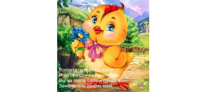 Воспитателя поздравим и на праздник скажем вам: "Вы на свете самый лучший заменитель наших мам."
