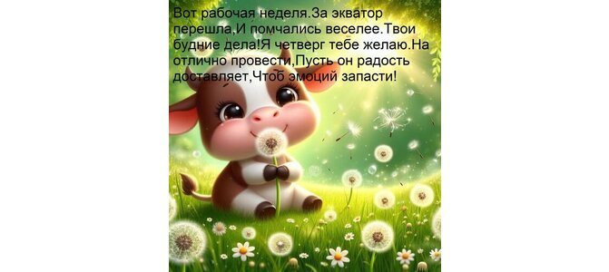Теги:вот рабочая неделя за экватор перешла, помчались, веселее, твои, будние, дела, четверг, тебе, желаю, отлично, провести, пусть он радость доставляет, чтоб эмоций запасти