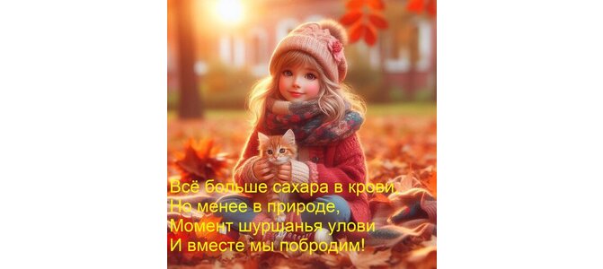 Открытка "Всё больше сахара в крови, Но менее в природе, Момент шуршанья улови И вместе мы побродим!"