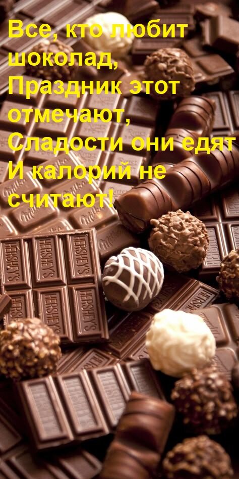 Открытка "Все, кто любит шоколад, Праздник этот отмечают, Сладости они едят И калорий не считают!"