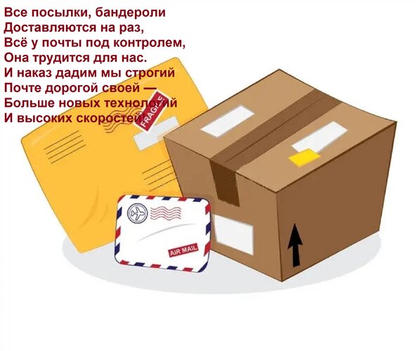 Теги:все посылки, бандероли доставляются на раз, всё у почты под контролем, она, трудится, для, нас, наказ, дадим, строгий, почте, дорогой, своей