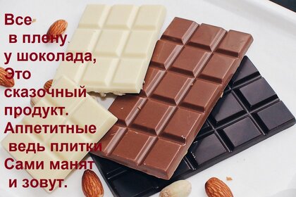 Открытка "Все в плену у шоколада, Это сказочный продукт. Аппетитные ведь плитки Сами манят и зовут."