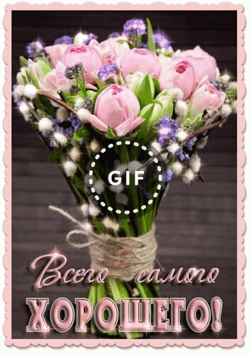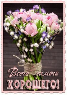 Красивый нежный букет из розовых тюльпанов и мелких фиолетовых цветов, перевязанный натуральной бечевкой. Изображение украшено декоративной розовой рамкой и поздравительной надписью на русском языке «Всего самого хорошего!». Идеально подходит для использования в качестве открытки, душевного пожелания или праздничной картинки для мессенджеров и социальных сетей.