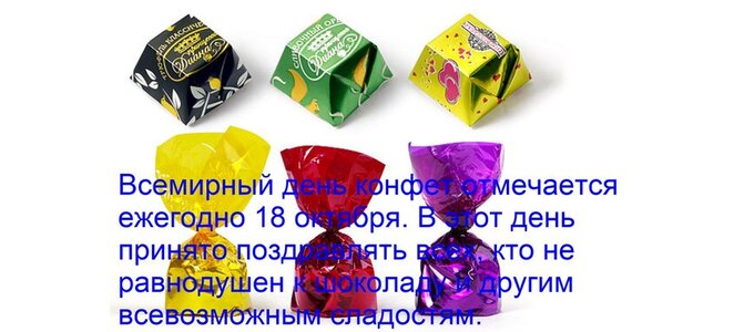 Теги:всемирный день конфет отмечается ежегодно 18 октября в этот день принято поздравлять всех, кто не равнодушен к шоколаду и другим всевозможным сладостям