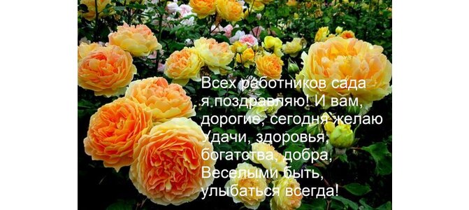 Всех работников сада я поздравляю! И вам, дорогие, сегодня желаю удачи, здоровья, богатства, добра, веселыми быть, улыбаться всегда!